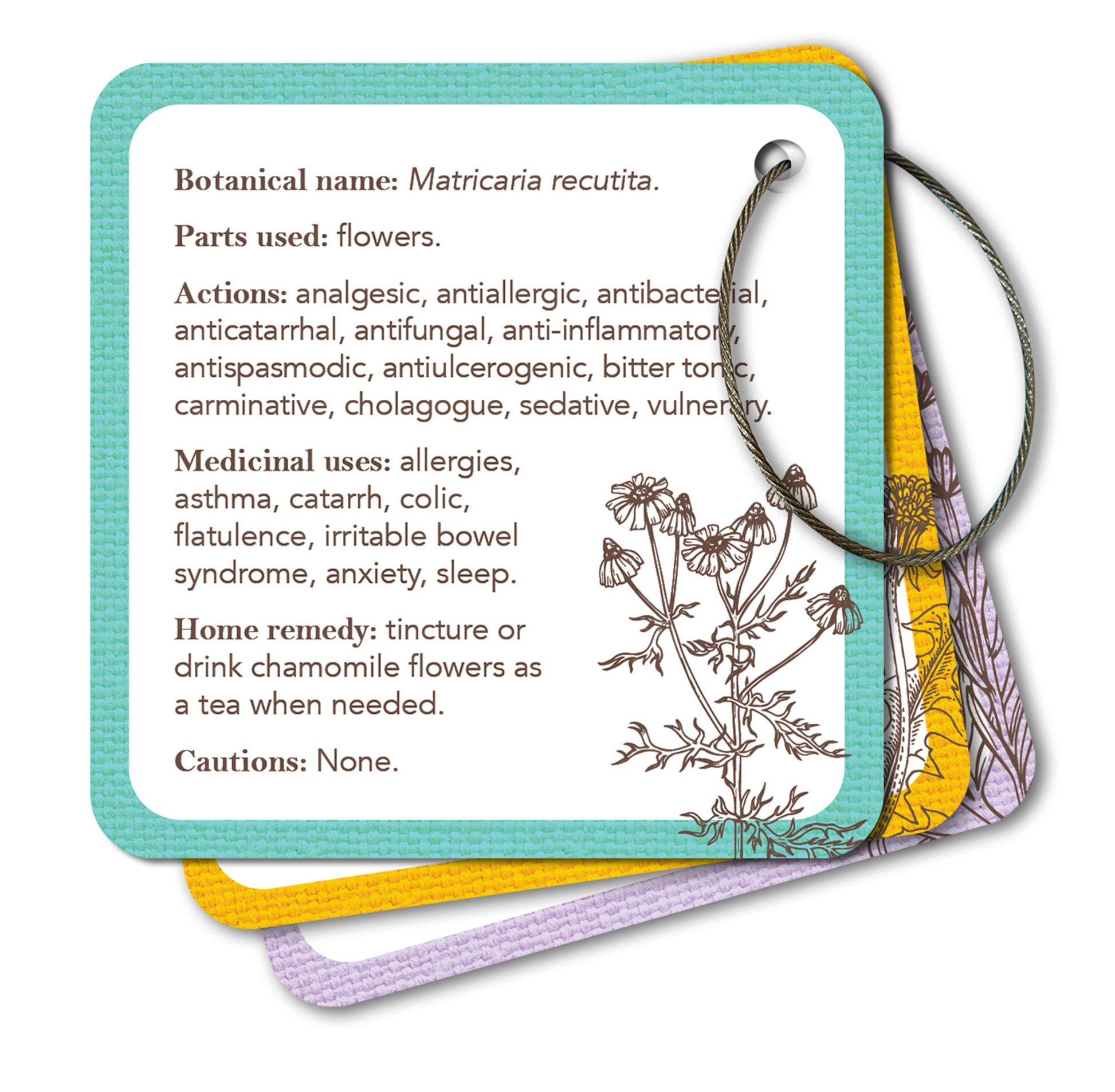 Packaged as a flashcard set consisting of 40 herbal cards with detailed, illustrated images on one side and symptom and conditions it can assist with on the other along with how to use them as a home remedy.