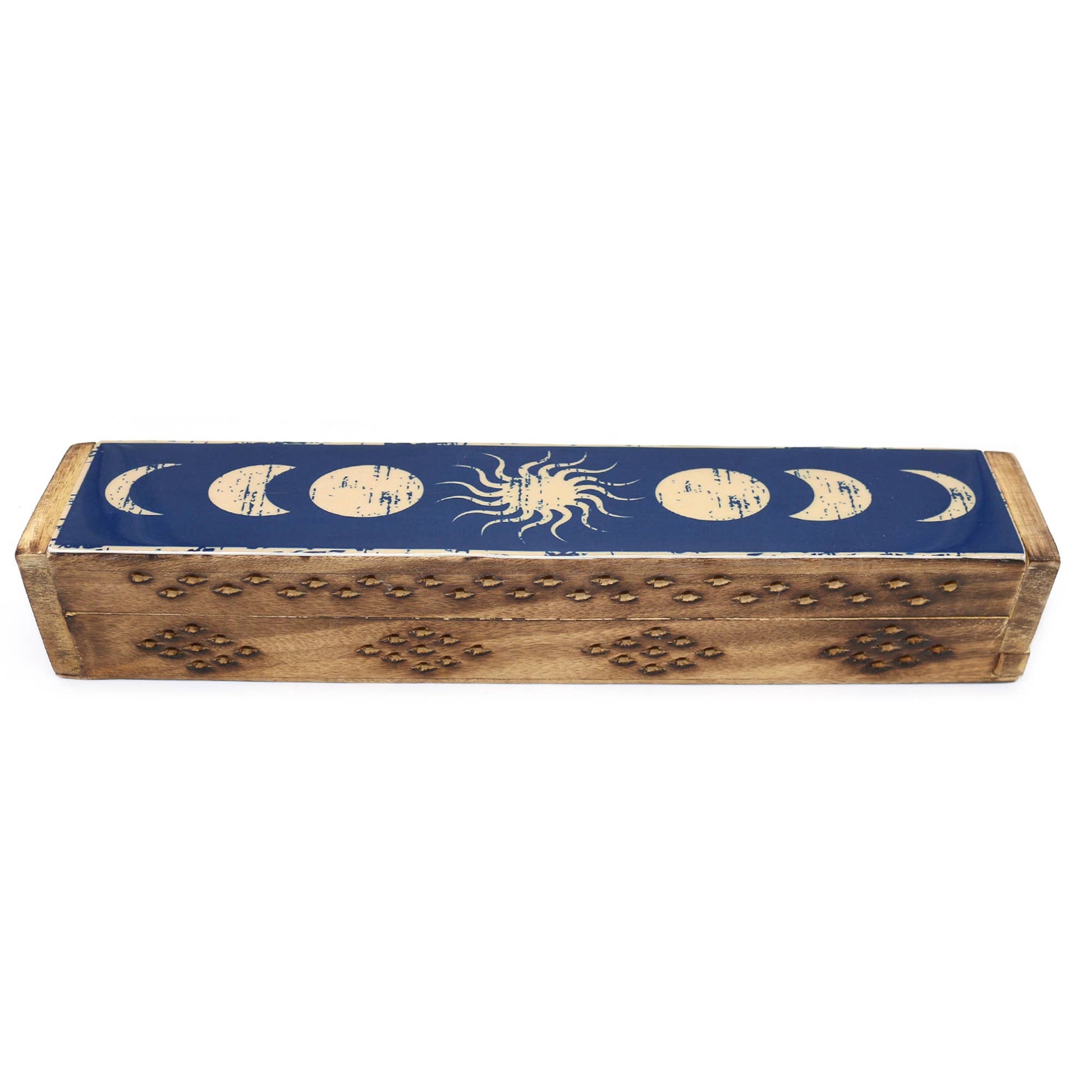 12" Celestial Phases Wooden Incense Coffin Box Hand-Carved from Mango Wood Mango Wood Incense Box Burner hand carved into a stunning ornament for your home, holding up to four pieces of burning stick or cone incense at a time, its fragrant and purifying smoke gently rises through the many decorative cut-outs in the shape of diamonds. These burners combine a classical Indian style with your favorite aroma and are designed specifically to enhance the natural dance of the incense fragrant smoke as it wafts out of the hand-carved pattern. HANDCRAFTED IN INDIA